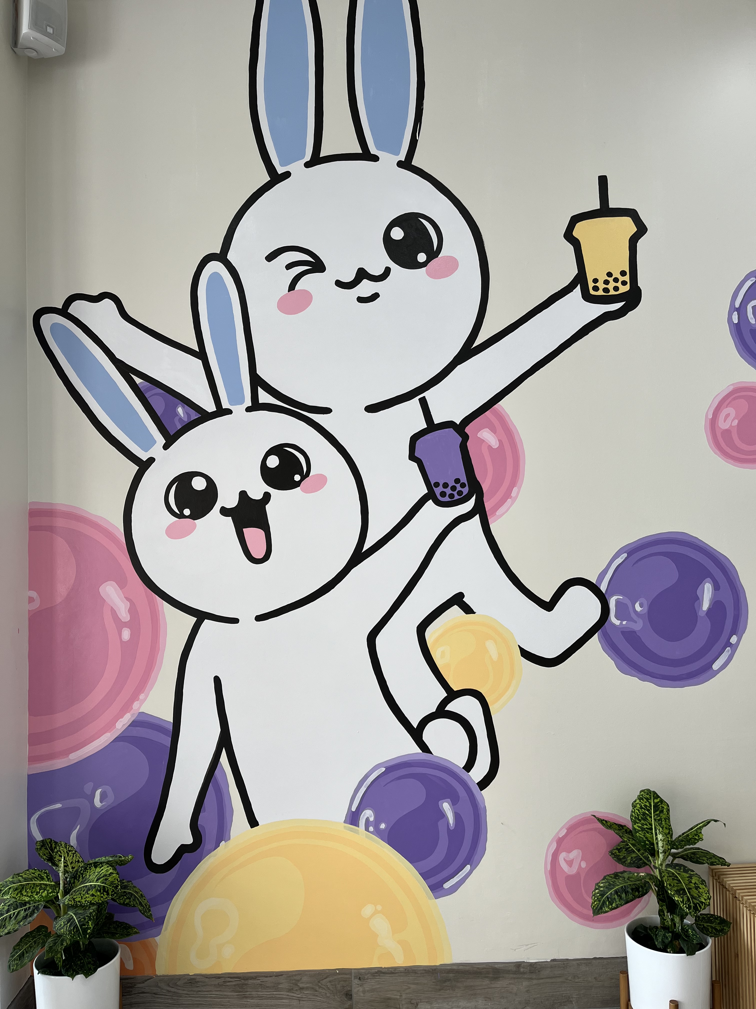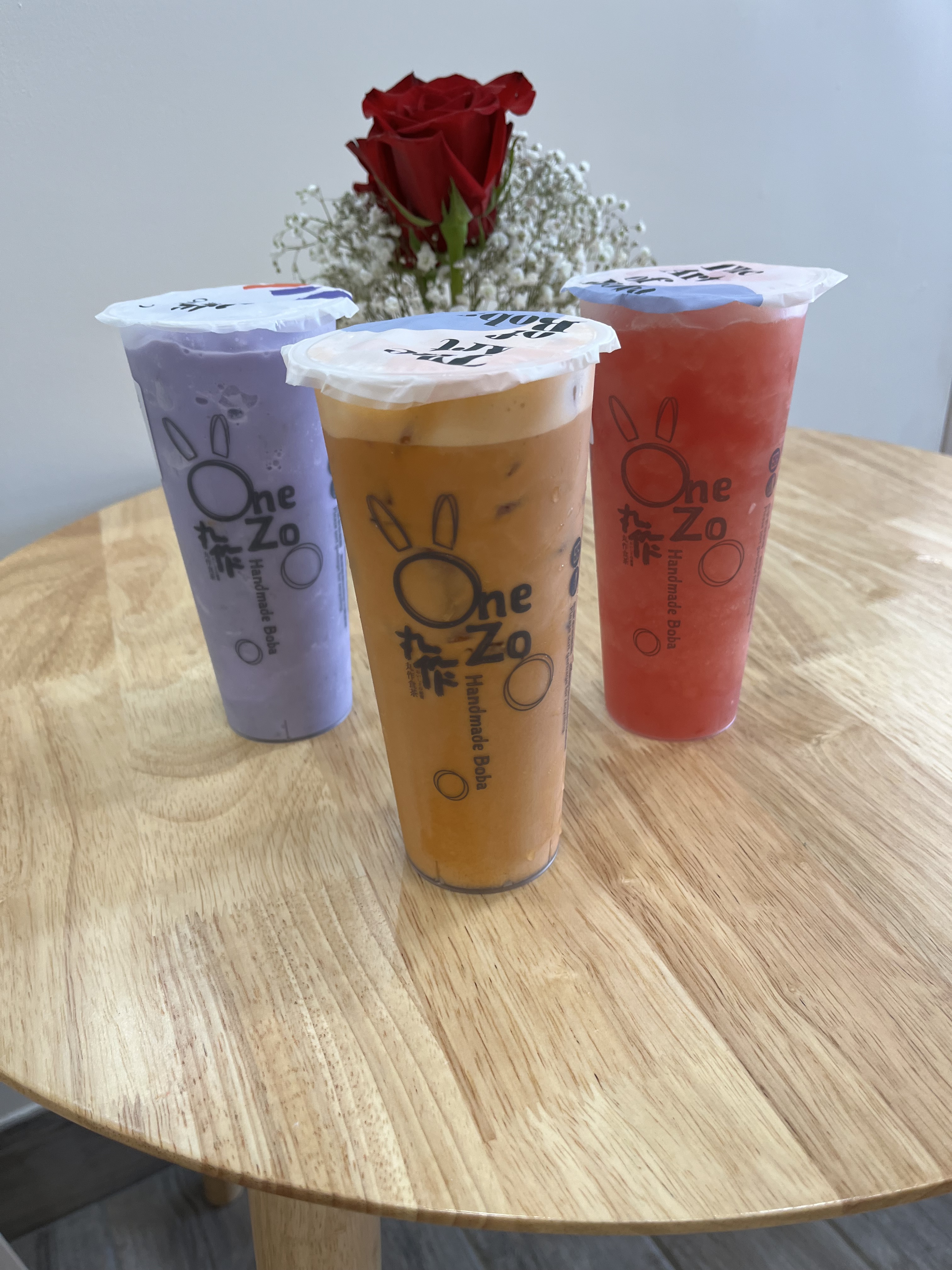 One Zo Boba Opened up about a week ago. It is in Ventura, CA. They sale tea lattes, fruit teas and smoothies. I love it that they use real fruit for their smoothies and fruit teas. I tried their strawberry green tea, iced Thai tea and Oz black tea latte. All the teas were so good. I love their drinks. Their place is cute. They have a rabbit painting on their wall, also flowers on the table.