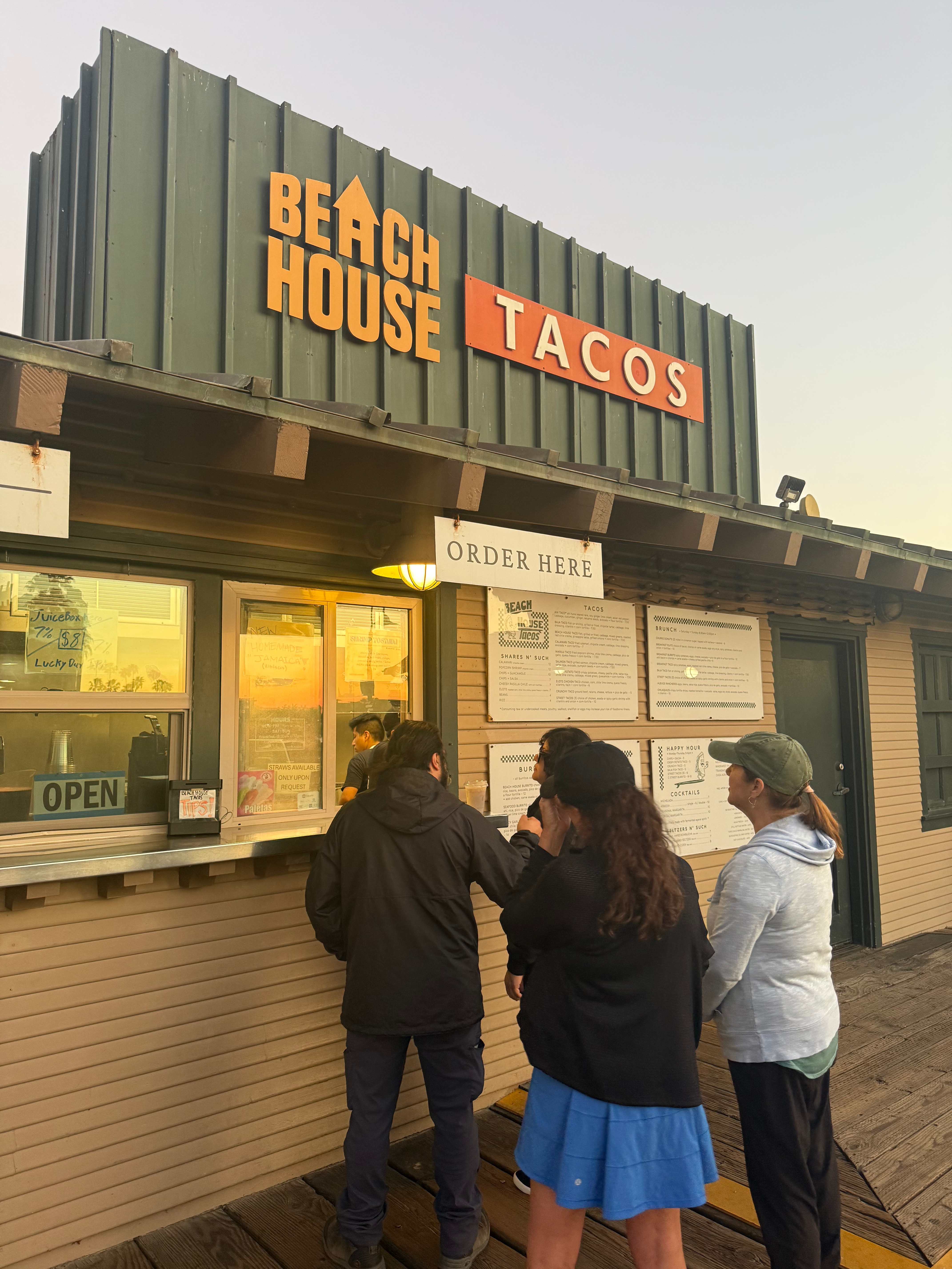 Now’s a good time to bring out that jacket. We made our way down to Beach House Tacos along the promenade. Tacos and ocean views are always a winning combination for me, so this felt like the right place to close out the day. The menu has plenty of options, but this is where things got interesting. While we were in line, I mentioned the $20 challenge to another customer. She immediately leaned in and said,