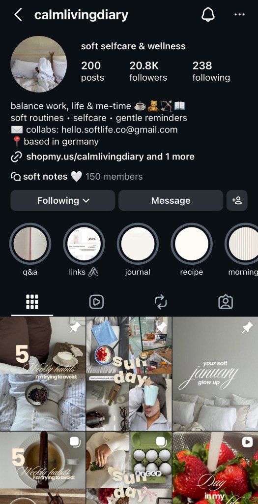 Check out https://www.instagram.com/calmlivingdiary?igsh=NTc4MTIwNjQ2YQ== for a fresh perspective of realistic self-care, reminders for when you need it most, and viewing content that will inspire you to live softly under your own terms 🙂