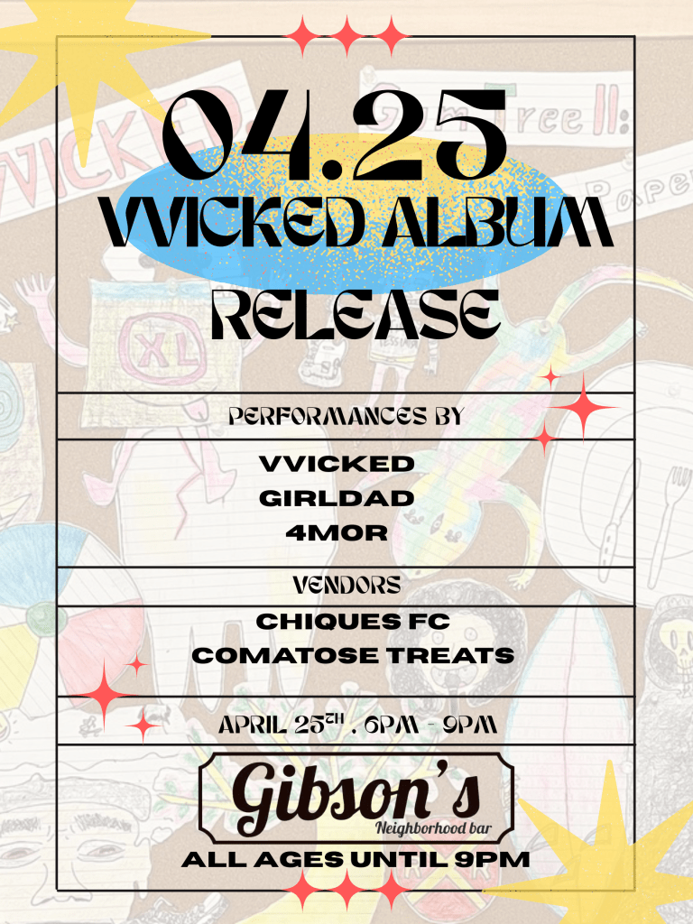 On April 25th, 2025 family, friends, and music lovers gathered at Gibson’s Neighborhood Bar in Downtown Ventura to celebrate VVicked’s album release party. The supporting acts included 4mor and Girldad. Comatose Treats also had a table to sell some delicious cookies. Read until the end to see some awesome pics and watch the concert coverage!