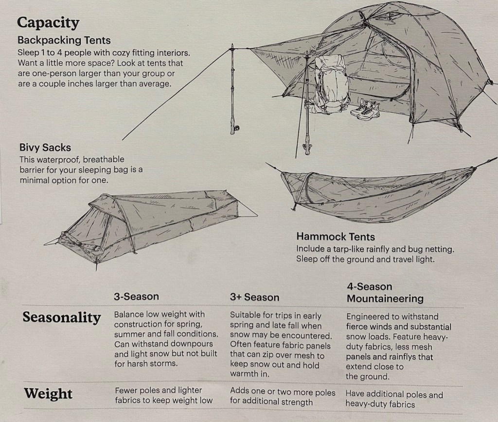 Now we need to look for shelter these tents aren’t the tents you typically use when camping these are going to be lighter. These tents are intended to be lighter because we will have to carry our tent in our pack. Typically the lighter the tent the more expensive they will be. You can also do a two-person tent with your friend or significant other if you are trying to split the costs. There’s a variation of tent brands from Nemo to REI, MSR and more.