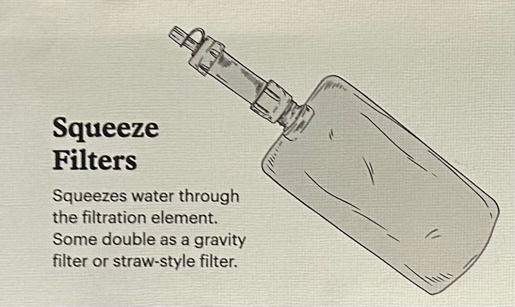 Having a water filter is ideal, especially when you are near water streams. Having a squeeze filter is practical at least for me because I can use the bag they give for my dirty water. Then squeezing the the clean water into my Nalgene. There are different types of of filters like bottle filters, purifiers, straw-style filters and squeeze filters.
