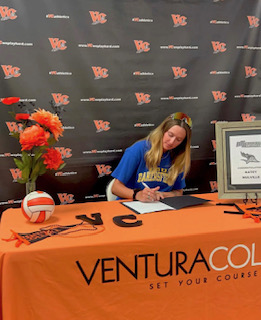 Katey Mulville #10 is a standout indoor and beach volleyball here at Ventura College. Just recently she announced she would be continuing her beach volleyball journey at a D1 school, CSU Bakersfield. The 6’0 kill generator provides a strong block in beach volleyball and can move great on defense. Being a student athlete about to transfer to a Division 1 school means that you have a pretty busy schedule, but Katey was still able to find time to answer some questions I had for her.